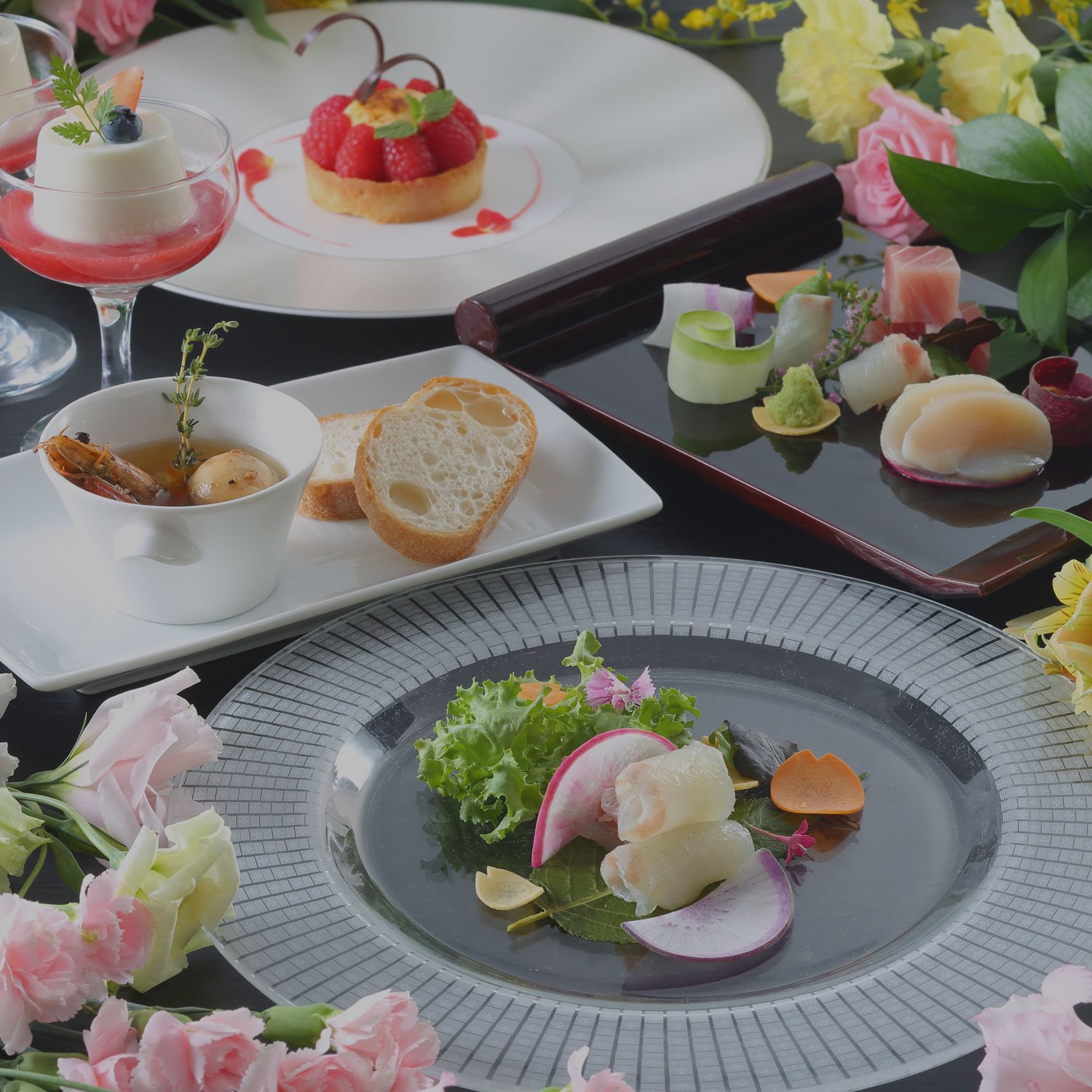 鴨燻製と菜の花のマリネ / オーストラリア産ローストビーフ カクテルソース / 雲丹のフラン 桜海老のソース