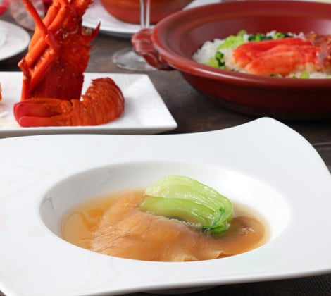 현지 보소만에서 잡아 올린 닭새우 및 명물 상어지느러미찜, 지바현산 와규 소고기와 송로버섯을 사용한 호화 메인 디쉬를 준비했습니다.