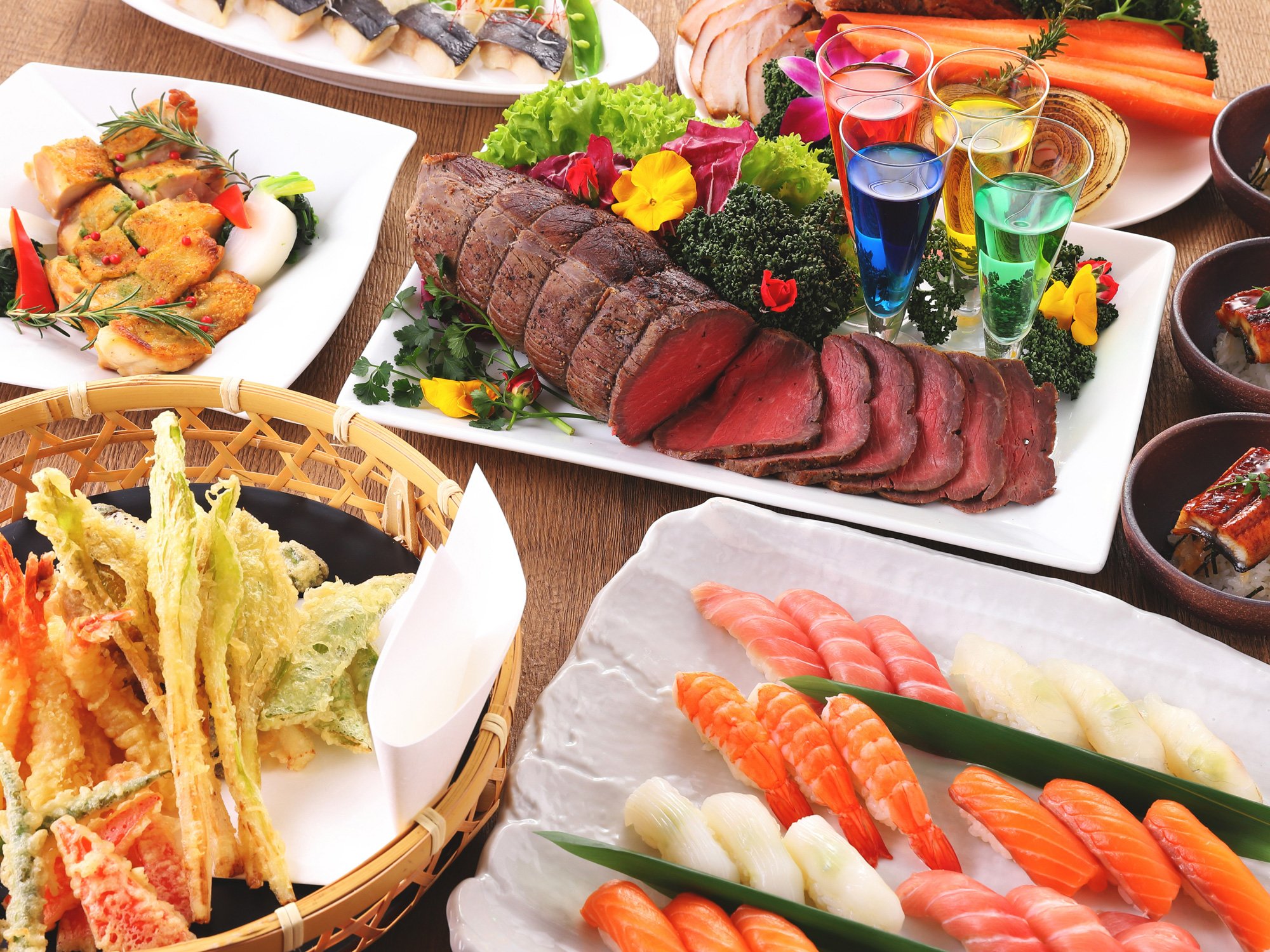 にぎり寿司各種、ビーフステーキ レフォールソース、ローストビーフ、チキンのガランティーヌ デミクリームソース、豚バラロースト 蜂蜜と黒胡椒風味、白身魚の味噌マヨネーズ焼き、スパゲッティーニ3種のソース、豚ロースカツレツ コルドンブルー トマトソース、本日の点心、日替わりスープ、日替わりカレー、ミニドルチェ、フルーツ他