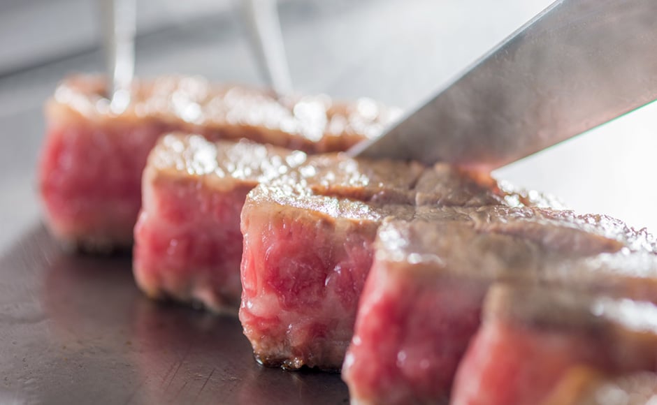 目の前で焼き上げるビーフステーキは旨味たっぷり。芳醇な香りと豊かな風味が口の中に広がります。