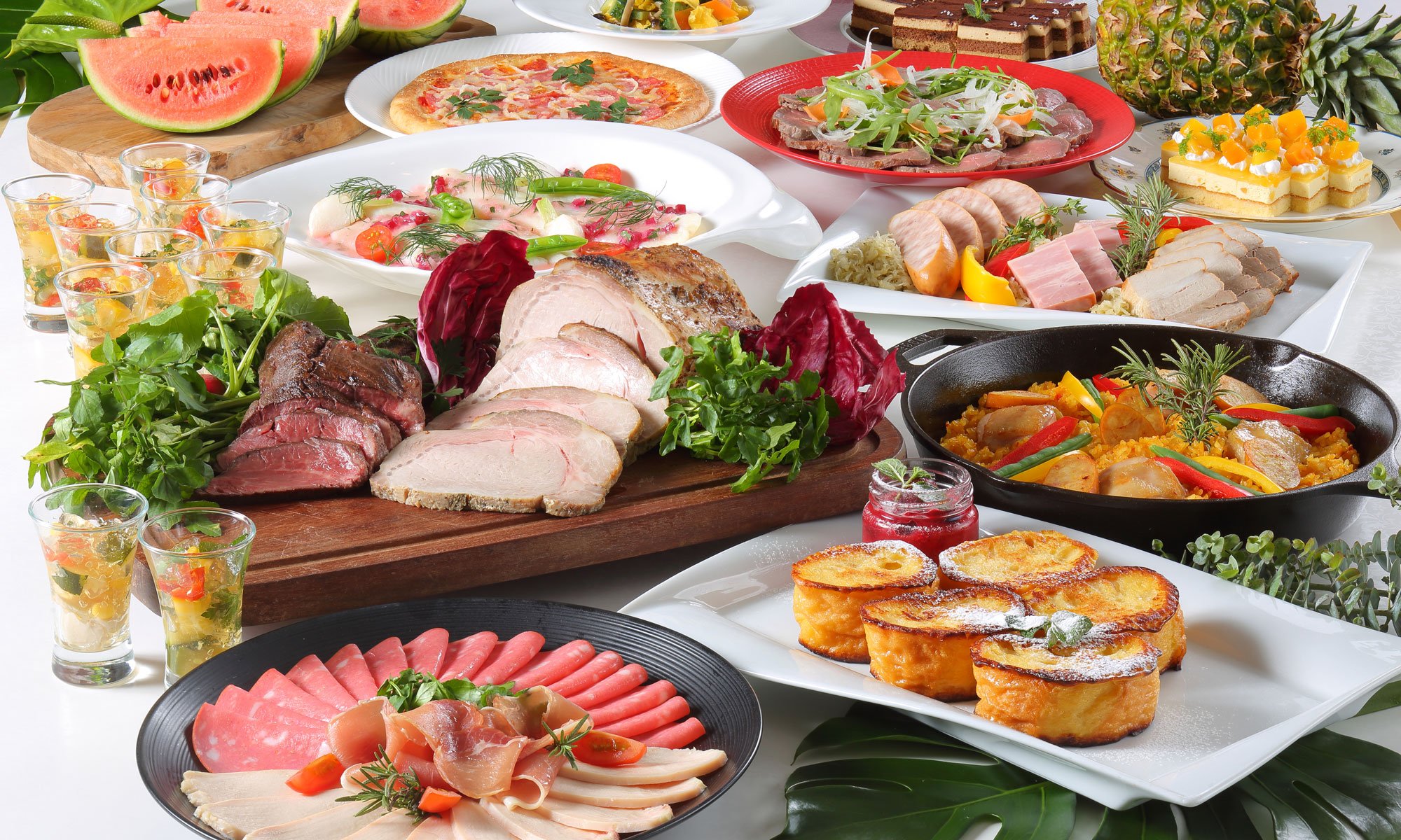 本日の前菜 / チキンと夏野菜のアスピック / コールドビーフ 香味野菜のヴィネーグレット / トマトのサラダ アールグレー風味 / 魚介のレモンクリーム/ソーセージと青味野菜のアーリオオーリオ / ★トマトのポタージュ/ホテルメイドカレー / 白身魚のポワレ ビーツのラヴィゴットソース / ★メバルとアサリのナージュ/ピサラディエール風 / ★プティポワ フランセーズ / シュークルート / チキントマトグラタン / 麻婆豆腐/鶏の豆乳クリーム煮 / 冷やし担々麵 / ミートパエリア / サラダバー / パン各種 / フルーツ / レアチーズケーキ / ティラミス / 杏仁豆腐 / マンゴープリン / フルーツゼリー / アイス各種 / ソフトクリーム etc