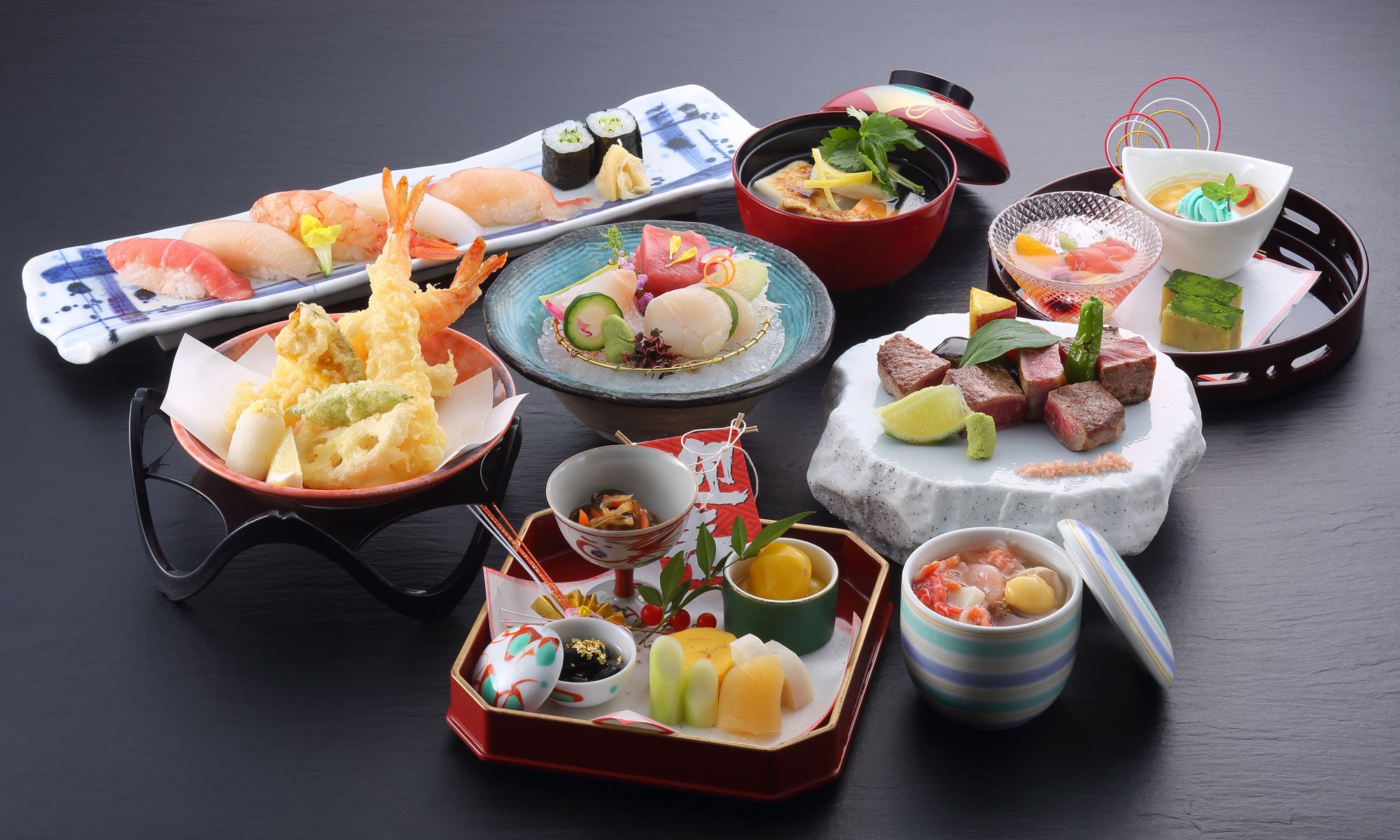 華やかな前菜から始まり、天ぷらや握り寿司、季節の逸品料理が一堂に揃った年末年始限定の贅沢御膳。ご家族やご親族が集まるこの季節に、お祝いの席を華やかに彩る料理をご堪能いただけます。事前予約でランチタイムのご利用も可能です。美味しい料理とともに、特別なひとときをお過ごしください。