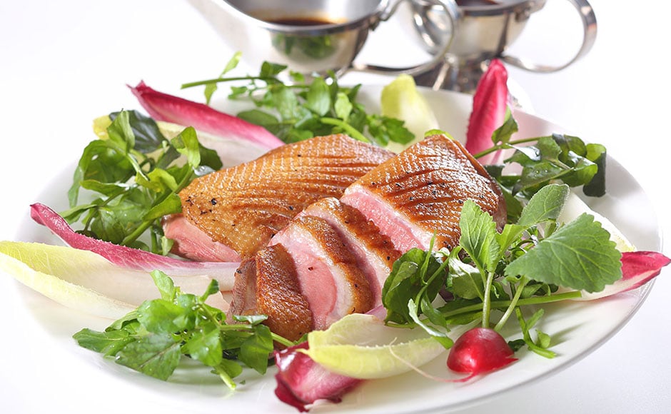 低温調理でじっくり火入れし、香ばしく仕上げた鴨肉。