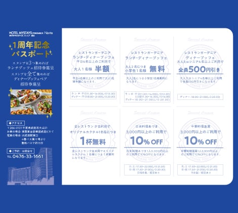 衷心感谢您素日对MYSTAYS 成田精品酒店的厚爱。 2019年3月1日(周五)起,为纪念本酒店新冠名成立1周年,特为在酒店餐厅内用餐的客人奉上“1周年纪念盖章卡”。